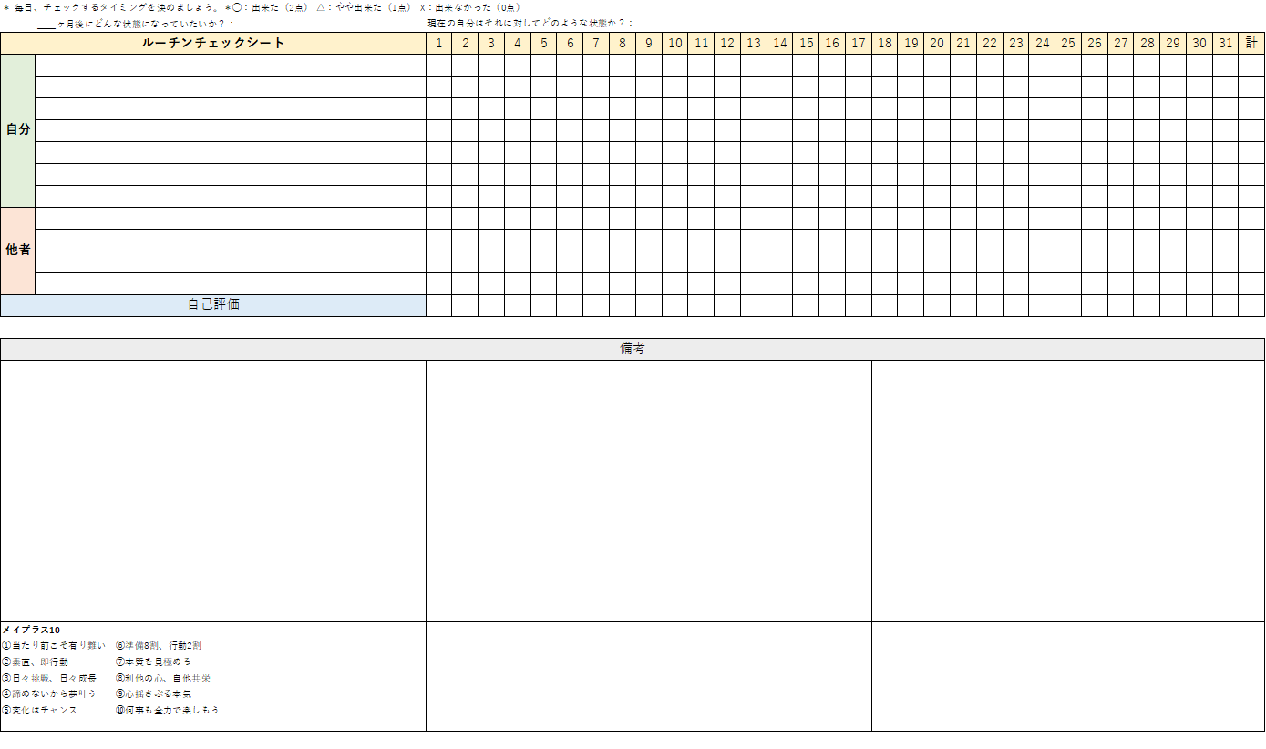 日々の行動、つまりルーティンが成長を後押しします。目標達成や成長に近づくためのルーティンチェックを毎日行なってください。